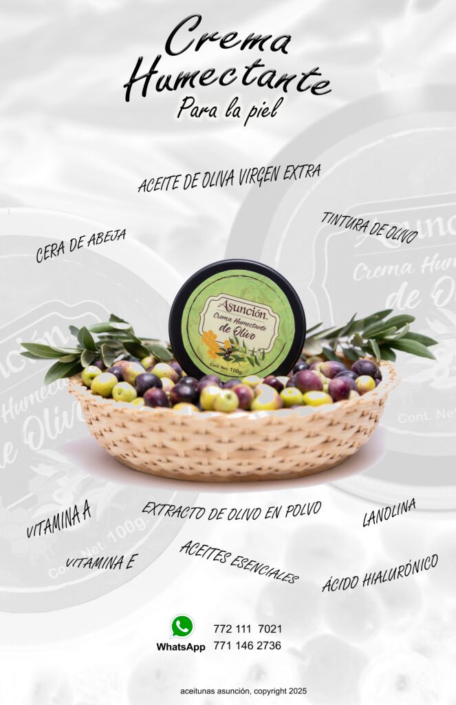 Aceitunas Asunción representa la actividad de la familia que durante años de trabajo, ha desarrollado el proceso de elaboración de la aceituna de mesa, teniendo como resultado las de presentación verdes en salmuera, verdes en escabeche, negras naturales en salmuera, pate de aceituna verde y pate de aceituna negra . El camino recorrido nos ha proporcionado la experiencia necesaria para conocer con profundidad los detalles del cuidado de la aceituna.
